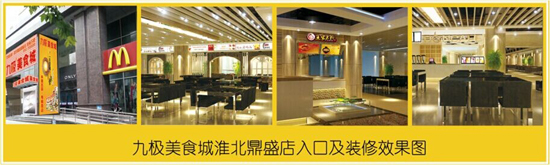 九極美食城是安徽九極營銷策劃有限責任公司鼎力打造的專業性餐飲美食主題文化廣場,位于鼎盛國際五樓商場,是九極美食城自宿州、淮南后的第三家分店。美食城面積約4000平方米,含20家檔口,3家獨立店,兒童娛樂區,水吧,具備幽雅的環境裝飾、配制高檔的餐桌餐椅,即將引進“麻辣四川、七彩云南、日韓料理、粵港美味、西北風情、吃遍江淮……中外特色經典美食”。