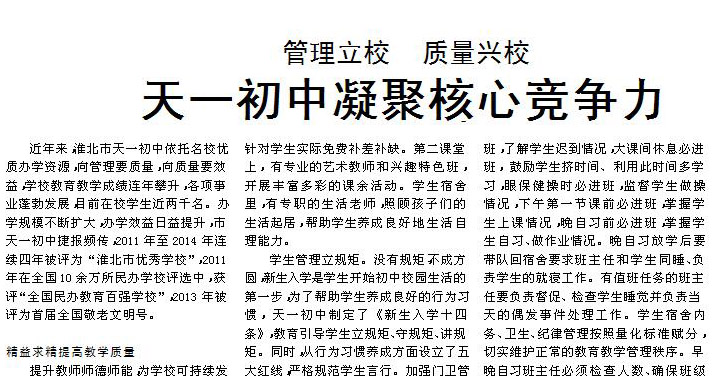 淮北晨刊連續(xù)報(bào)導(dǎo):天一初中凝聚核心競(jìng)爭(zhēng)力