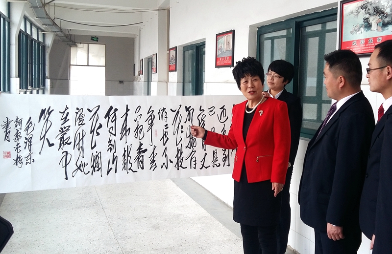 在“書法進校園”活動現場,郭光梅校長帶領學校師生學習書法,親自講授學習書法的心得,師生們學書法、練書法、品書法,整個校園充滿著濃濃的書法藝術氛圍。